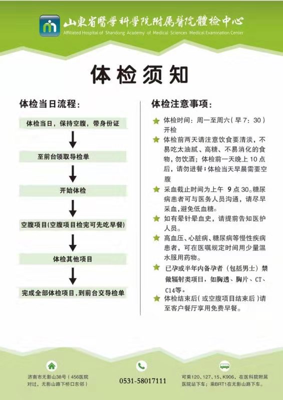 (二)體檢地點(diǎn):山東省醫(yī)學(xué)科學(xué)院附屬醫(yī)院體檢中心(位置:濟(jì)南市無影山38號(456醫(yī)院對面)1號樓查體中心);