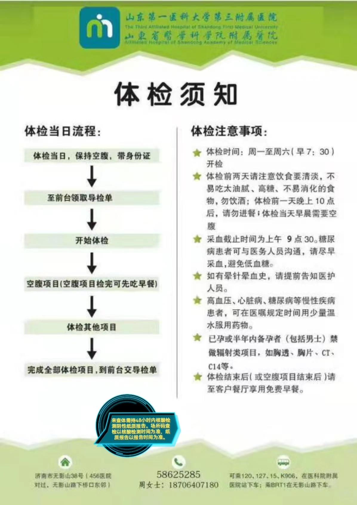 (二)體檢地點:山東省醫(yī)學(xué)科學(xué)院附屬醫(yī)院體檢中心(位置:濟南市無影山38號(456醫(yī)院對面)1號樓查體中心);